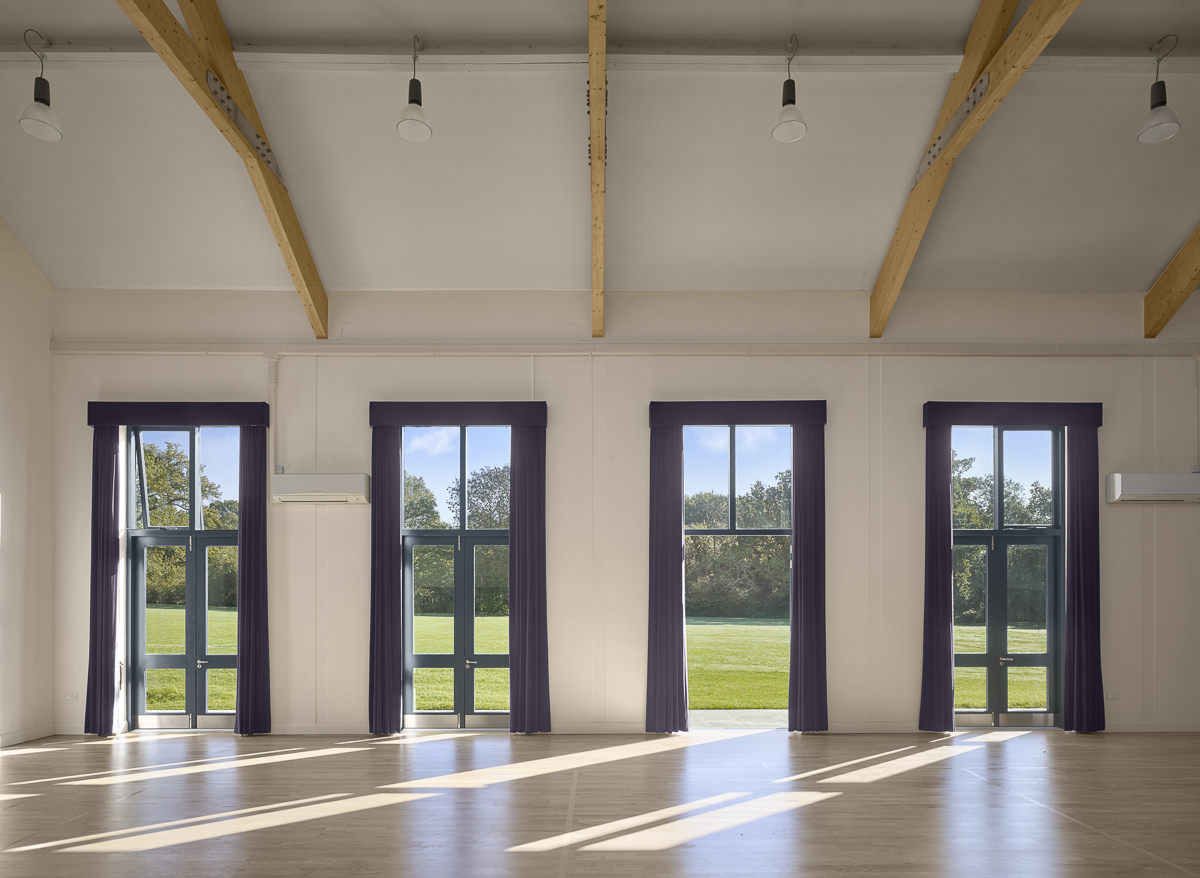 Reception-style layout in the main hall.The large hall set up for a formal gathering.Views out from the hall across the green space.The small hall works well for classes, meetings and smaller parties.The hall and grounds can support indoor and outdoor moments across the day.Decor can be styled for celebrations and special occasions.